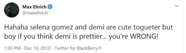 https://twitter.com/fbchkdmg/status/1306974171596050432?ref_src=twsrc%5Etfw%7Ctwcamp%5Etweetembed%7Ctwterm%5E1306974171596050432%7Ctwgr%5Eshare_3&ref_url=https%3A%2F%2Fwww.pedestrian.tv%2Fentertainment%2Fmax-ehrich-selena-gomez-demi-lovato%2FThere's a lot going on in the thread, but the main takeaway is that Ehrich seemed to have an obsession with Lovato's ex-best friend Selena Gomez.