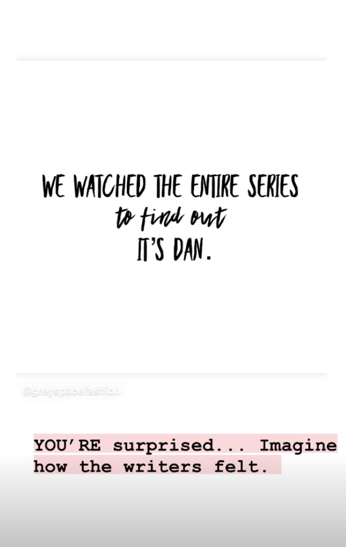 She reposted a meme that read "We watched the entire series to find out it's Dan", and added: "YOU'RE surprised... imagine how the writers felt."