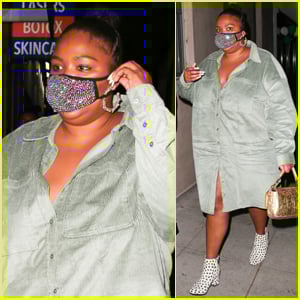 For her night out, Lizzo looked cool in a green, corduroy dress paired with white and black polka-dot booties and a sparkling face mask while Courtney was seen staying safe in a” “Vote” face mask.