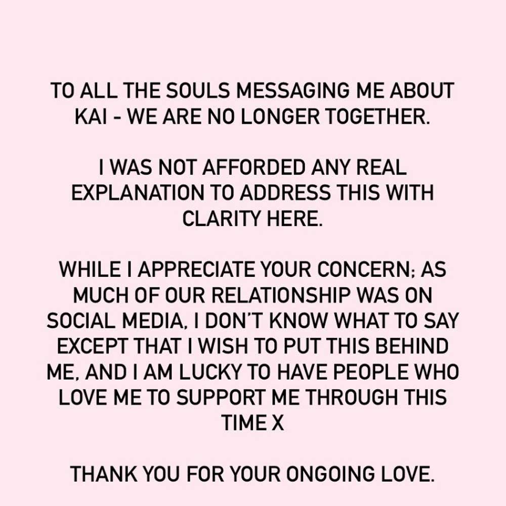 "To all the souls messaging me about Kai — we are no longer together. I was not afforded any real explanation to address this with clarity here," Origliasso began.