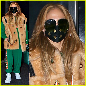 Jennifer Lopez wears a green sweatsuit and a fur vest while leaving a rehearsal studio on Monday evening (December 28) in New York City.