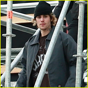 Justin was spotted wearing a a gray jacket paired with a black beanie and black sweatpants as he chatted with crew members on set.