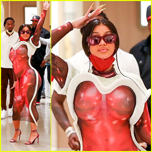 The -year-old “WAP” rapper rocked the interesting look down the floor, and showed off all her curves in the semi-sheer look with a white top and detailing.