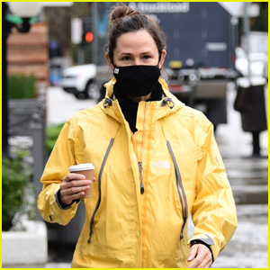 Jennifer braved the rainy weather in a yellow raincoat and black leggings for her outing. She stayed safe in a face mask for her walk, but removed it occasionally to take sips of her coffee.