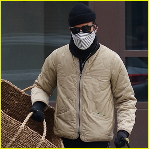 Justin bundled up in a tan jacket, black beanie, gloves, and a scarf while staying safe in a face mask for his quick afternoon outing.