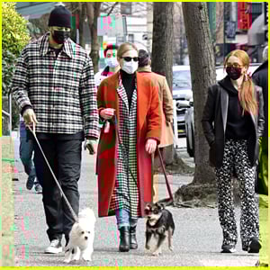 Lili Reinhart wears an orange coat while out walking her dog Milo on Saturday (March 6) in Vancouver, British Columbia.