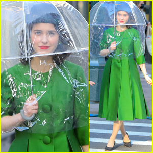 Rachel looked straight out of the ’50s in an emerald green outfit paired with a blue hat while she spent the day filming scenes for the upcoming fourth season of the hit Amazon Prime series.