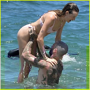Adam showed off his many tattoos shirtless, and Behati wore a pink and white bikini.